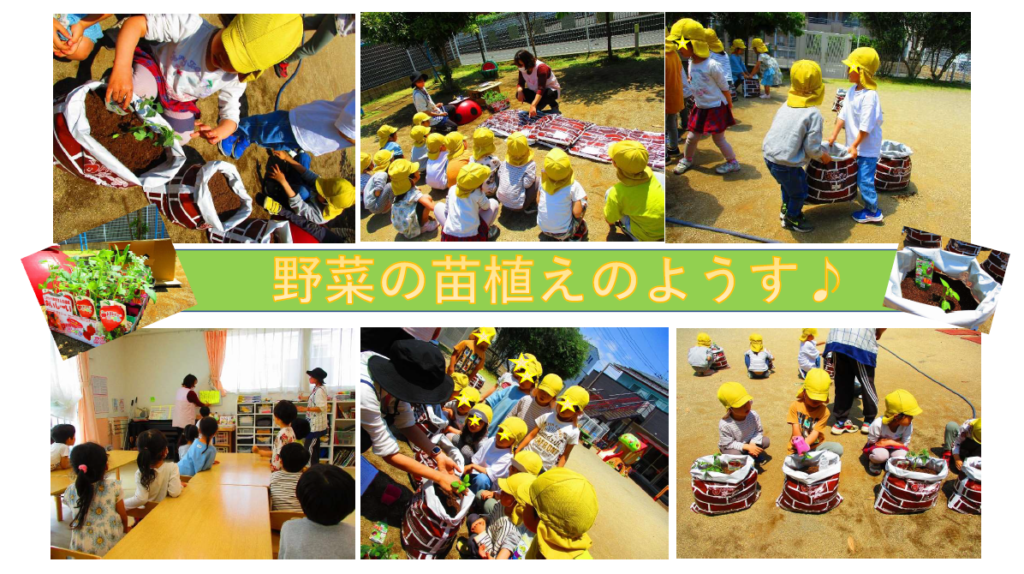 大宮たんぽぽ保育園 きょうは、やさいの苗をみんなで植えたよ!!トマトやパプリカなど毎日、成長がたのしみです♪