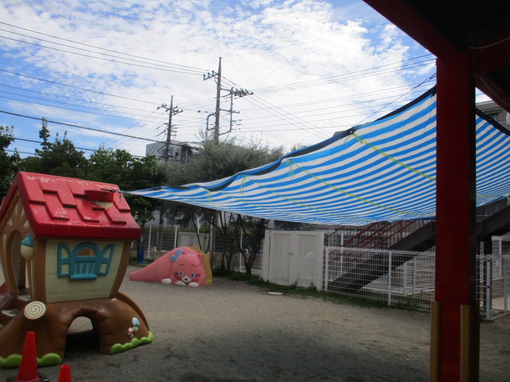 水遊びや戸外活動を行う際の熱中症対策として、日よけシートを設置しました。