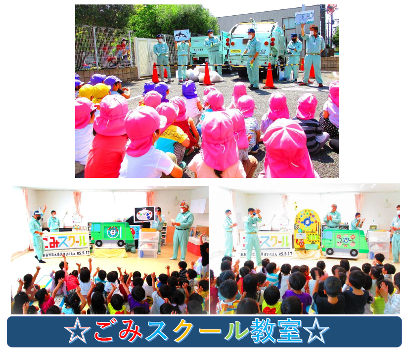 「しげんの有効活用」と「ごみの減量」ごみスクール授業の様子☆リサイクルやおしごとのようすを学んだね。大宮たんぽぽ保育園授業のようす。