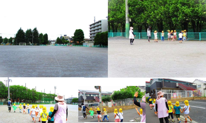 帰りの道も、保育士の先生といっしょに、交通あんぜんをまもり、みんなで園までかえりました。